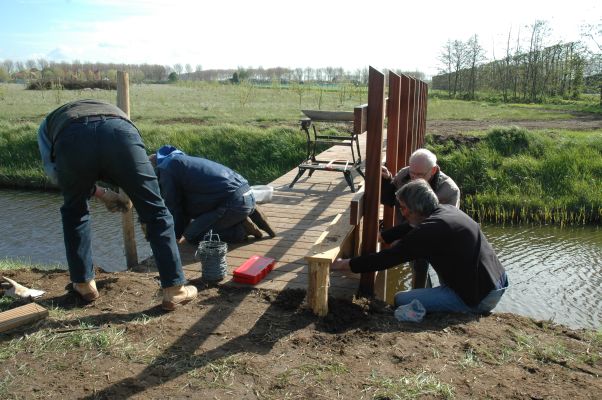 Begin april werden in het kader van de wandelpaden "Ommetje Nieuw- en Sint Joosland" door de firma Harthoorn 2 bruggetjes over de Visserie geplaatst, nr. 1 aan het Molenpaadje ( voor de echte Nieuwlanders het Kaaidiekje ) en nr. 2 aan de Molendijk tegenover Boomkwekerij van de Waart. Tegelijk werden er trappen in de dijk gerealiseerd. Hoewel de wandelroutes nog niet van alle richtingsbordjes voorzien zijn ( dit wordt voor de zomer nog gerealiseerd door een groep vrijwilligers in samenwerking met SLZ ) is op 16 april de aanzet hiervoor door wethouder Chris Simons gegeven. Terwijl het begon te regenen, werd in theater "de Wegwijzer" in aanwezigheid van zo'n twintig belangstellenden eerst stilgestaan bij de voorgeschiedenis van het Dorp van de Toekomst en de totstandkoming van de wandelroutes door Willy Oorthuijsen (Coach groep Natuur Dorp van de Toekomst ). Hierna gaf Karin Mol van de Stichting Landschapsbeheer Zeeland ( SLZ ) uitleg over wat er zoal komt kijken bij het realiseren van deze routes, die ook aansluiten op het wandelnetwerk Walcheren. Zodra het weer het even toeliet zijn we over het Molenpaadje ( wat overigens pas uitgevlakt is door het Waterschap Scheldestromen ) naar de nieuwe bruggen toegelopen, waar wethouder Chris Simons het eerste plaatje op de hier staande richtingspaal vastschroefde. Onmiddellijk daarna gevolgd door Izaäk de Rijke ( één van de vrijwilligers en lid van de groep Natuur van Dorp van de Toekomst ), die plaatje nr. 2 erop vastzette. |